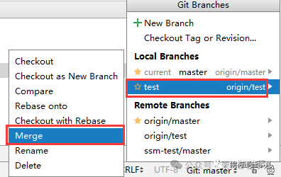 3.1.5、 代码合并代码合并是个技术活,这里提2个点 第一点是合并注意事项:1)、由开发人员发起合并,对于冲突比较多的,可以2个人以上进行合并;2)、系统参与者 评审人员 review通过后,才正式合并到分支。 第二点是合并方式:可基于命令行也可基于Idea git插件代码建立分支与合并分支。 以下基于Idea git插件方式进行代码合并说明: 3.1.5.1、建立分支git默认的主分支名字为master,一般团队开发时,都不会在master主分支上修改代码,而是建立新分支,测试完毕后,在将分支的代码合并到master主分支上。 操作如下1、idea git分支的操作idea git的操作在右下角,如下图: 说明: