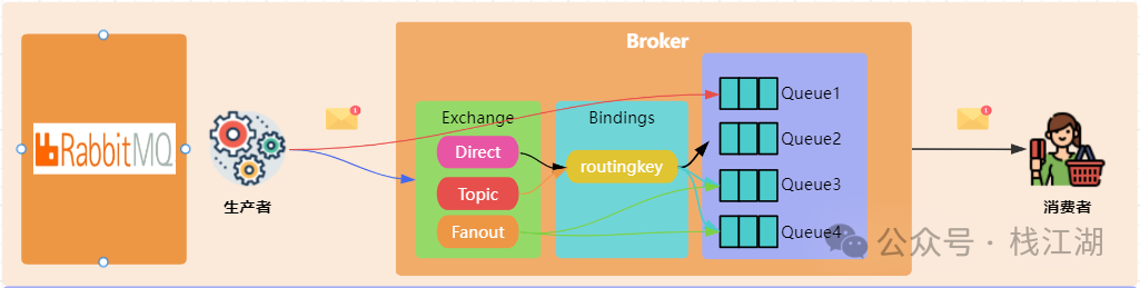 交换机(Exchange):消息发布到交换机,通过路由键(Routing Key)决定消息发送到哪个队列。