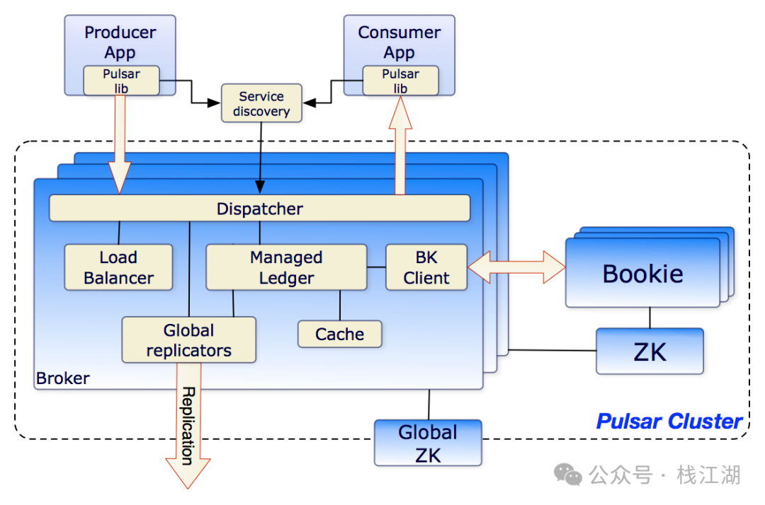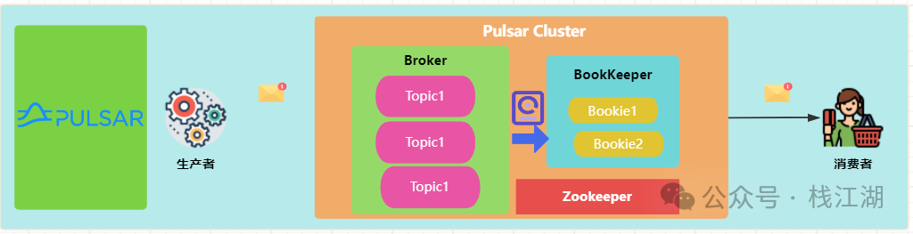 BookKeeper(Bookies):提供持久化存储,将消息存储在多个 Bookie 中,确保数据可靠。