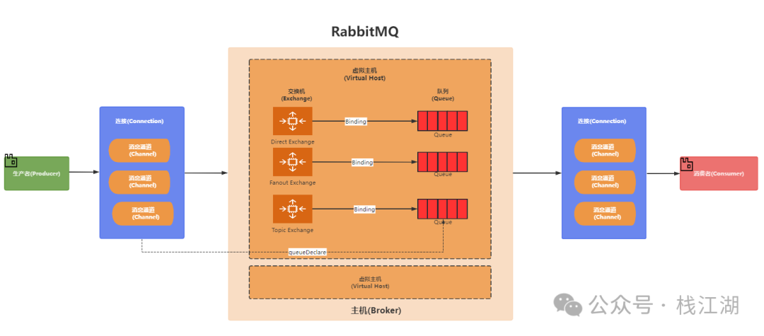 队列(Queue):消息存储的地方,消费者从队列中获取消息。