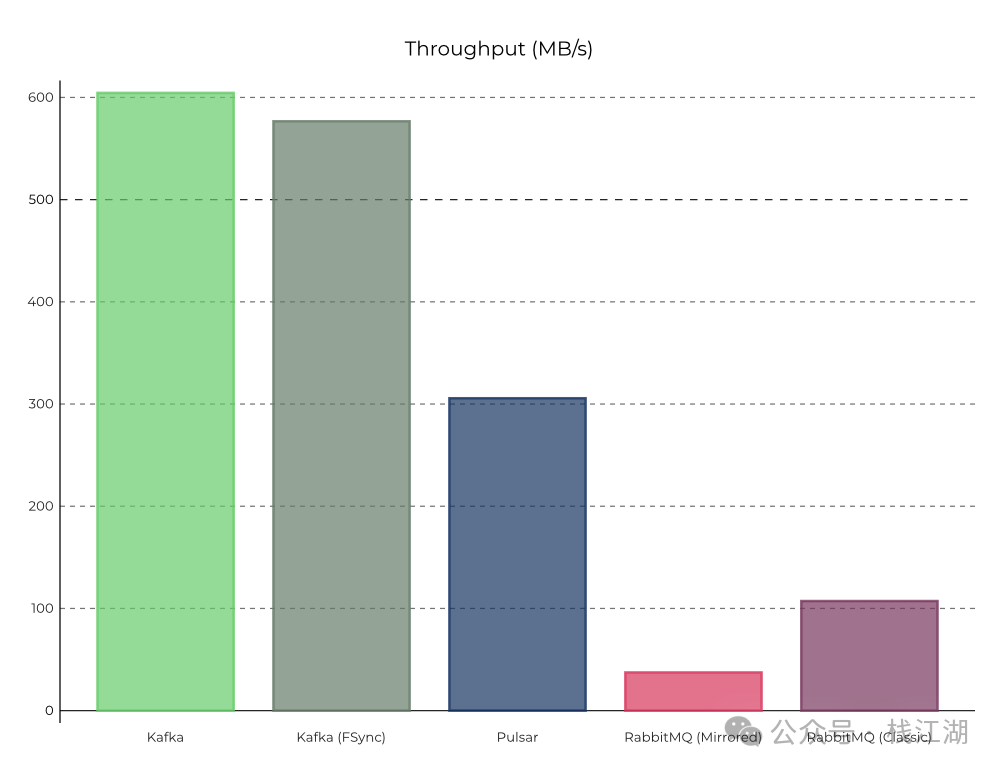 Kafka:专为高吞吐量和低延迟设计,适合大规模数据流处理,吞吐量最高。