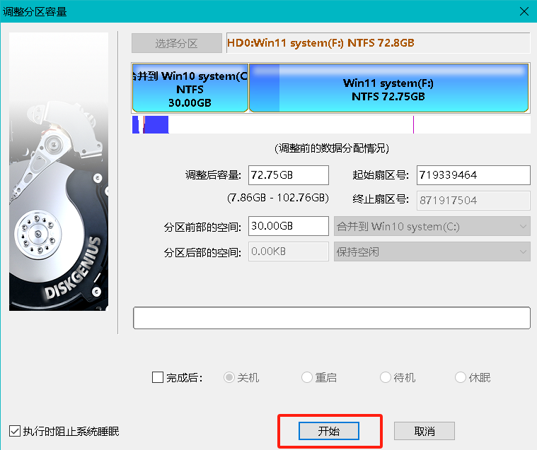 4.默认点击“开始”,这时候电脑会提示你自动重启完成扩容操作;