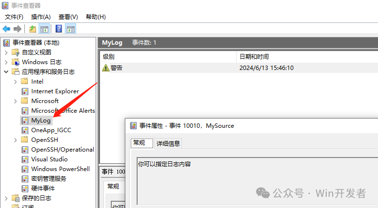 运行后,可以看到增加了一个MyLog日志,并增加了一条类型为警告的记录
