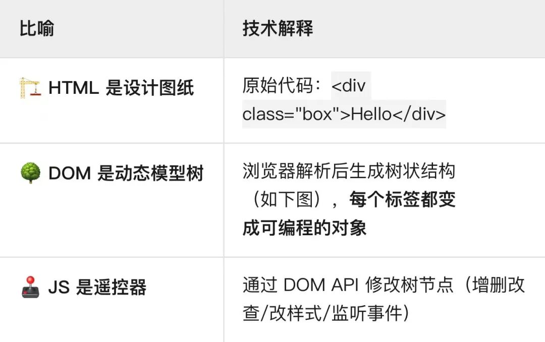 💡 重要性:DOM 是网页变成动态应用的核心枢纽,没有它 JavaScript 无法修改页面。 超直观案例演示: DOM的真实应用场景 1.购物车动态更新 点击"加入购物车" → DOM修改右上角数量显示 2.表单即时验证 输入密码时 → DOM实时显示强度提示 3.单页应用跳转 点击导航菜单 → DOM替换内容区,无需刷新页面 4.动态加载内容 滚动到页面底部 → DOM自动加载新内容 💡 一句话总结DOM是浏览器内存中的动态网页遥控器,JavaScript通过它让静态网页"活"起来,每个点击/滑动/输入都能触发实时变化。 阅读原文:原文链接 该文章在 2025/8/4 18:21:51 编辑过 |