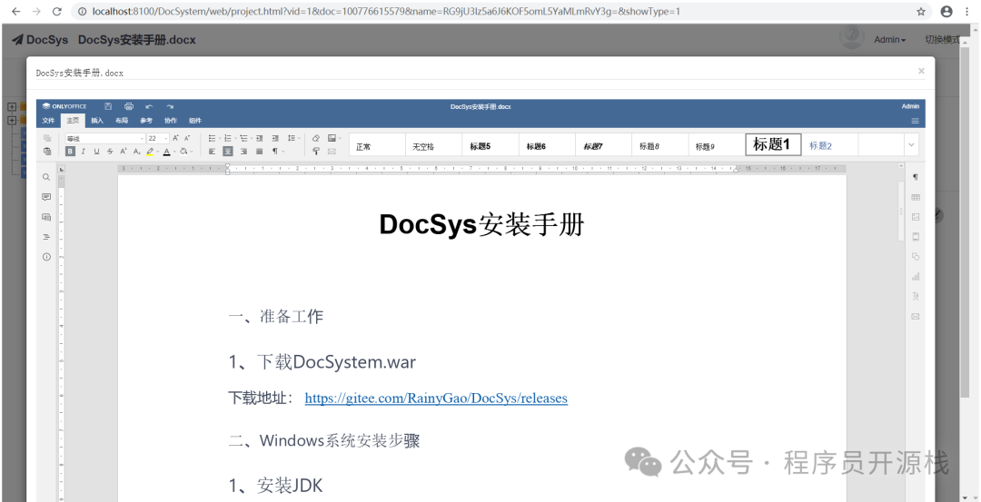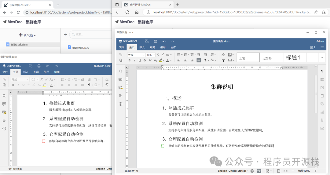 整个系统模块化设计清晰,便于功能扩展和维护。 项目体验 项目效果部署完成后,用户可以通过浏览器访问 MxsDoc 的 Web 管理界面,进行文件上传、下载、编辑、分享、搜索等操作。 系统界面简洁直观,操作逻辑清晰,即便是初次使用的用户也能快速上手。文件管理功能完善,支持多仓库管理,每个仓库可独立配置权限、加密策略、备份规则等。 在协同办公方面,Office/WPS 文件的在线预览和编辑功能非常实用,无需依赖本地软件即可实现多人协作。AI 功能的接入也使得知识库内容的搜索与处理更加智能化。 集群部署的支持,使得系统在企业级应用中也具备良好的扩展性和稳定性。 多仓库支持支持定义各自的文件存储、版本管理、权限管理、全文搜索和文件加密规则 存储更安全本地化文件存储方案,避免系统意外损坏对仓库文件造成影响 历史版本采用目前最流行的SVN和GIT版本仓库,支持增量历史版本管理,支持脱离MxsDoc系统进行访问 在线编辑支持各种文本文件在线编辑,支持Office/WPS文件协同编辑,无任何外部依赖(无需安装和部署其他Office编辑软件或系统) AI大模型接入支持接入Deepseek、Ollama等多种AI大模型,让知识库更加智能 文件分享支持文件和目录分享,支持访问权限设置和密码访问控制 全文搜索支持文件名、文件备注、文件内容搜索,让文件查找更加快捷方便 后台管理支持用户管理、用户组管理、仓库管理、系统管理 集群部署支持热插拔式集群,服务器可随时加入或退出集群,支持参数一致性检测,无需人工检查 项目源码源码托管在 GitHub 和 Gitee 上,便于开发者下载、学习和二次开发。 GitHub:https://github.com/RainyGao-GitHub/DocSys/releases Gitee :https://gitee.com/RainyGao/DocSys 项目包含完整的安装包、升级包和部署说明,适合不同阶段的开发者使用: