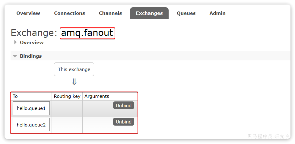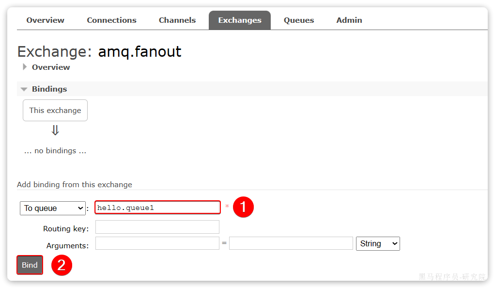 点击Exchanges选项卡,点击amq.fanout交换机,进入交换机详情页,然后点击Bindings菜单,在表单中填写要绑定的队列名称: