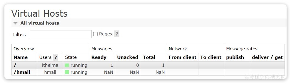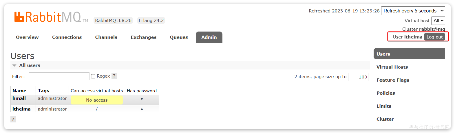 这里的用户都是RabbitMQ的管理或运维人员。目前只有安装RabbitMQ时添加的itheima这个用户。仔细观察用户表格中的字段,如下: