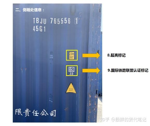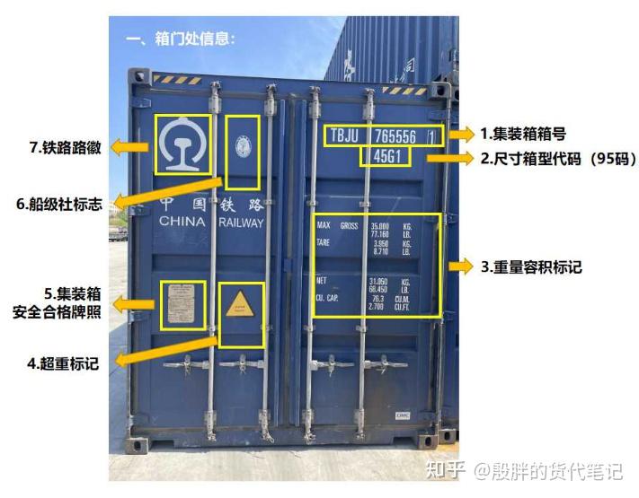对于超重(总重超过30.48吨)的集装箱,可以看到有“SUPER HEAVY”的黄色三角形超重标记,一般在柜门或侧壁上都有显示。 5.铁路集装箱安全合格牌照