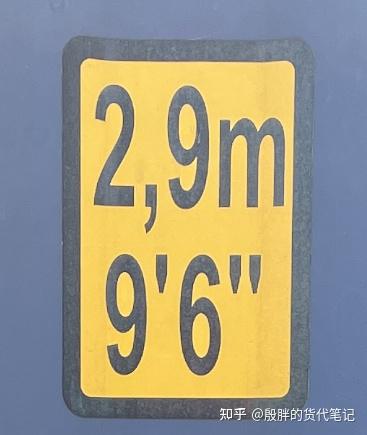 所有超过2.6米(8'6")高的集装箱,均需在集装箱的两侧张贴此标记。放置于距集装箱顶端1.2米、右侧0.6米的位置,样式为黄底黑字。标记上半部分数值以米为单位,下半部分则是转换为英制单位的数值。上图表示该柜高度为2.9M(9英尺6英寸)。 9.国际铁路联盟认证标记