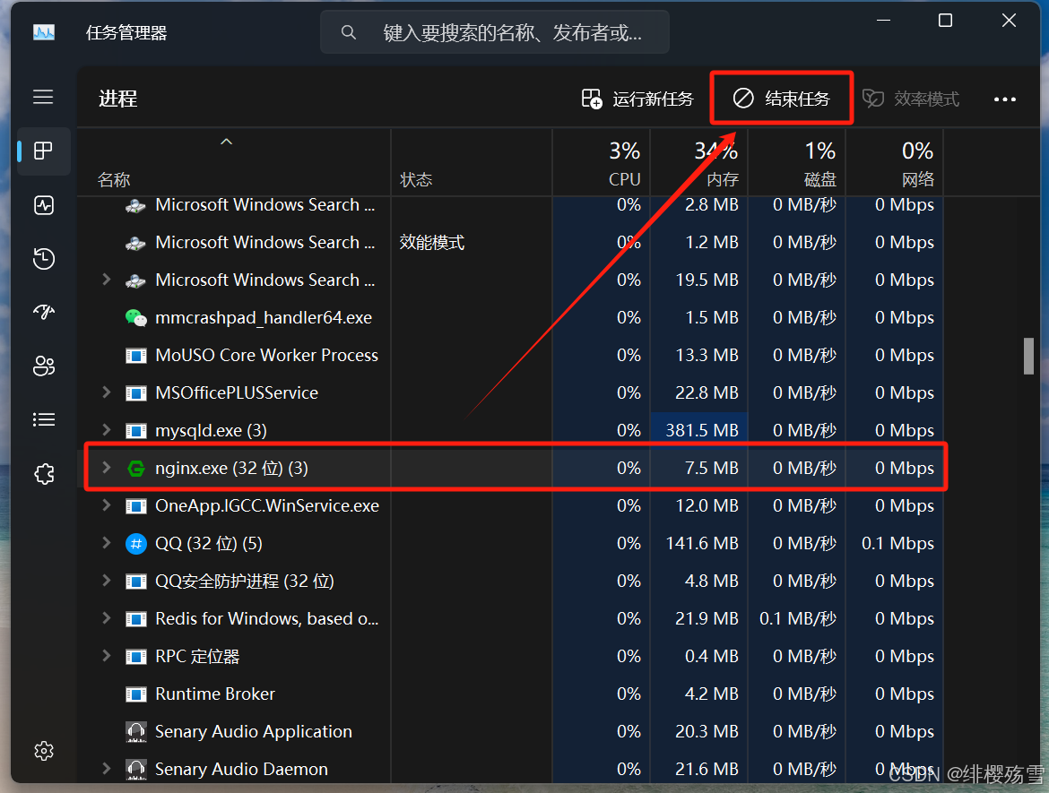 3. 如果需要修改配置文件,则需要重新启动 Nginx,首先 Ctrl + Shift + Esc,打开任务管理器,找个 Nginx 服务,结束任务,然后切换到 Nginx 安装目录下,双击 Nginx.exe 启动 Nginx