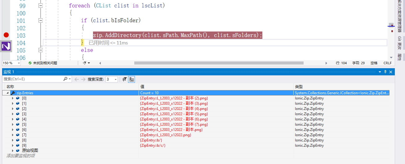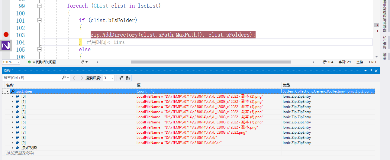 我们可以看到,在添加前,ZipFile.Entries是空的。 在添加后,变化如下: