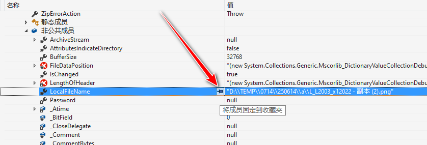 会遇到超长路径(MAX_PATH)报错,肯定会有一个完整的路径,当然存在临时拼接的情况,但是我们先找一找。 最后,我们在“非公开成员”中找到一个属性:LocalFileName,其值正是完整的文件路径,如下图所示: