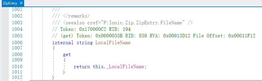 现在我们找到这个关键的LocalFileName,虽然还不能百分百确定和这有关,但是可以以此为准进行后面的排查和验证了。 三、反编译梳理逻辑像DotNetZip,是开源的,我们可以直接找到源码来查看,对于非开源的,我们就只能反编译了。 这里常用的工具是dnSpy,我们使用dnSpy打开DotNetZip,然后定位到ZipEntry,再找到LocalFileName属性: