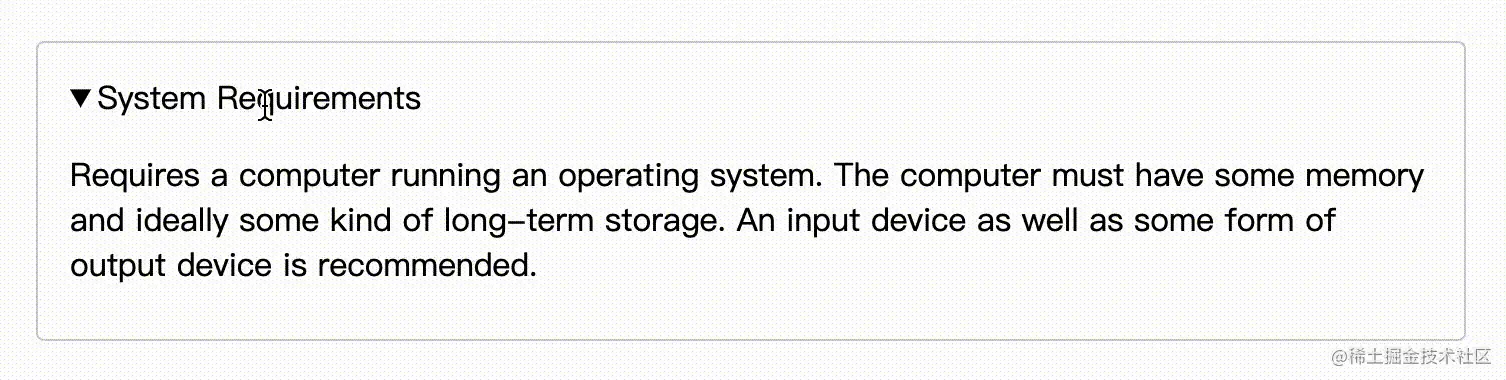 简单回顾一下,整体结构需要利用到 details 和 summary,天然地支持内容展开和收起。这里有一个 MDN 的例子