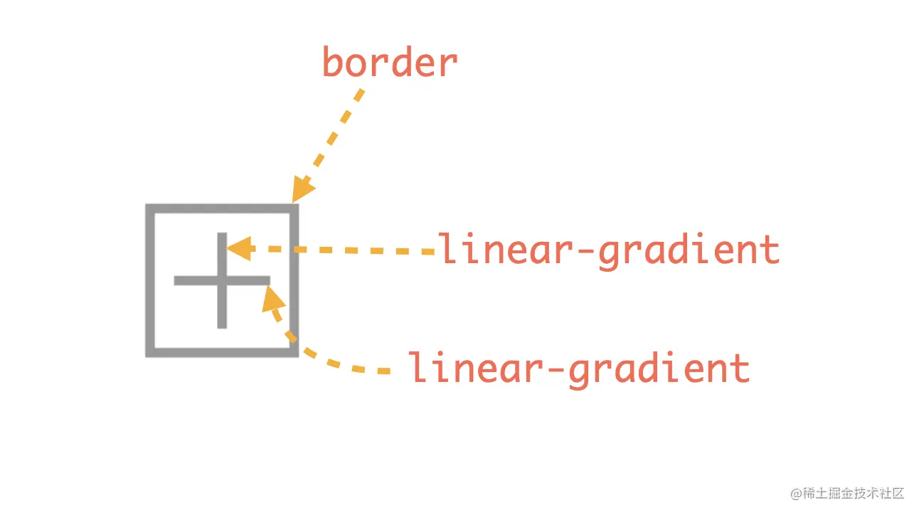 然后,绘制加号(➕)和减号(➖),由于还有外围一个正方形边框,我们可以用伪元素来绘制(当然,这是在可以使用的情况下),好处是可以直接用border画边框,这比用渐变方便的多,然后加号就是两段线性渐变,如下