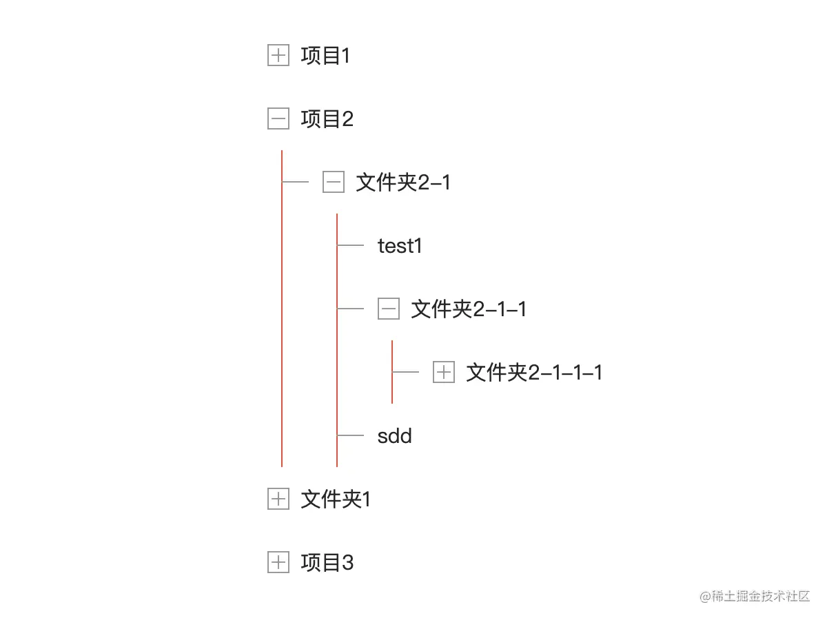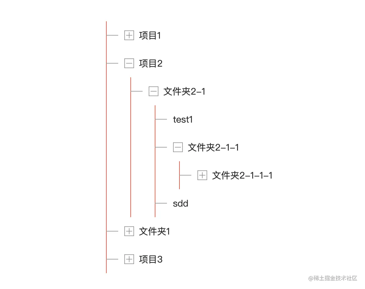 直接绘制可能有些难度,我们可以分解开来,一部分是垂直的,指向树的每个标题部分,所以直接绘制在summary上,还有一部分是竖直的,并且竖直部分会包含整个展开部分,因此可以把线条绘制在details上,用代码实现如下(为了区分,下面把垂直部分用红色表示)