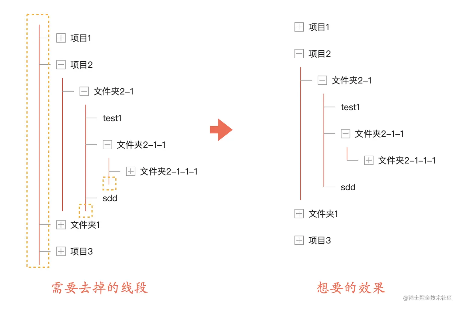 看着好像有些凌乱?确实有很多线是多余的,比如树的最后一个节点,垂直线段不应该继续向下延伸了,最左侧的线也是多余的,下面是示意图,我们其实想要右边那样的效果