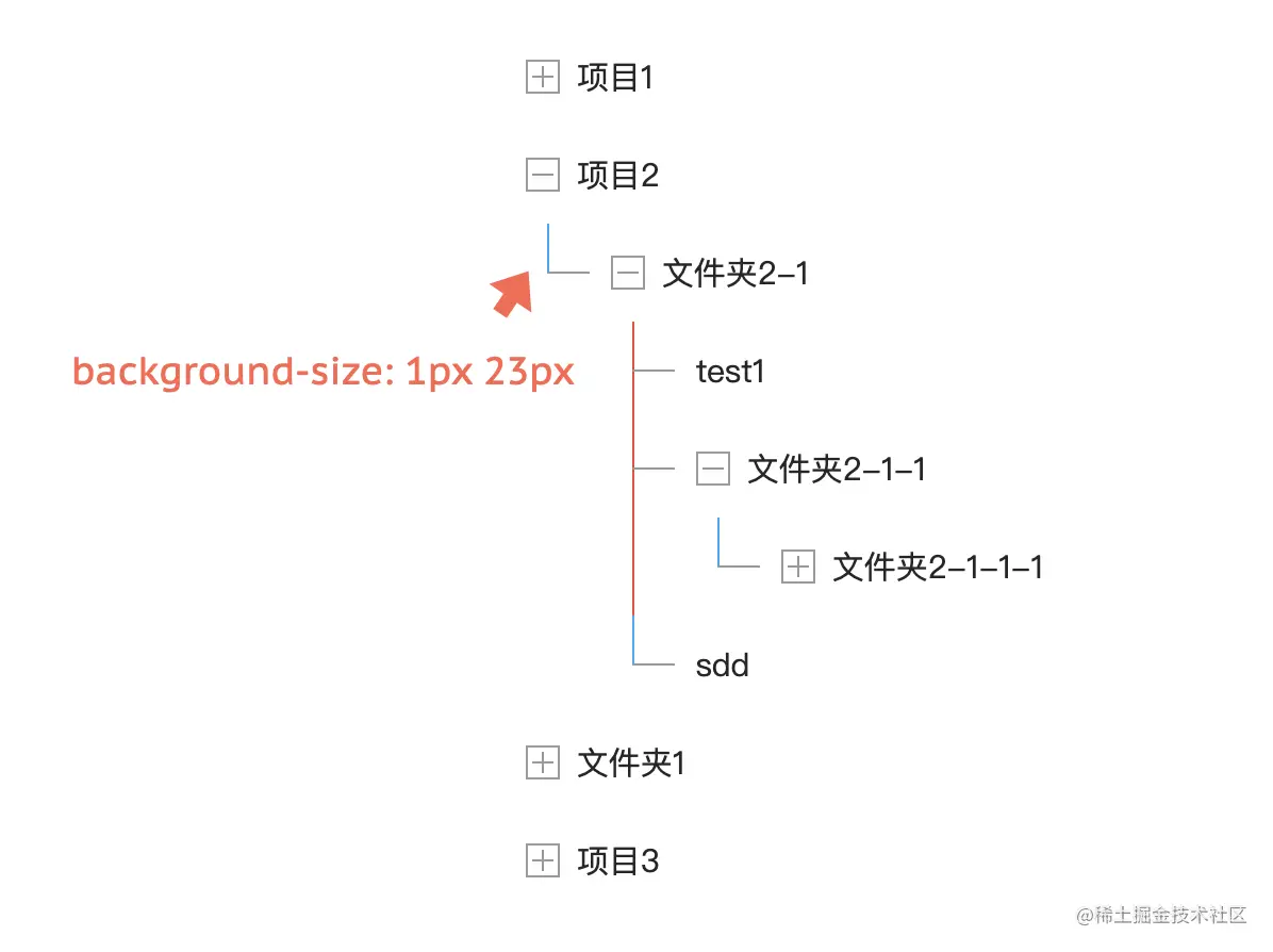 然后就是每层的最后一个子节点,如何将垂直线段去除呢?其实可以从HTML结构上入手,最后一层,其实就是最后一个details,所以将最后一个的背景尺寸改为刚好和垂直线段吻合