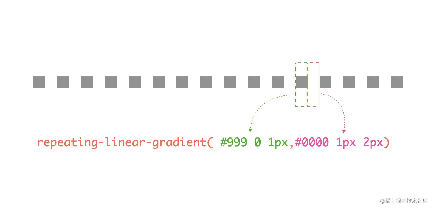 实线画出来了,虚线还远吗?同样也可以用渐变实现,只不过需要用repeating-linear-gradient,因为虚线其实是不断重复的从实色到透明的渐变,示意如下