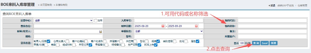 6.进入入库界面后,查询对应的BOE组件来料单,如果找不到可以通过编号和名称查找。最后点击查询