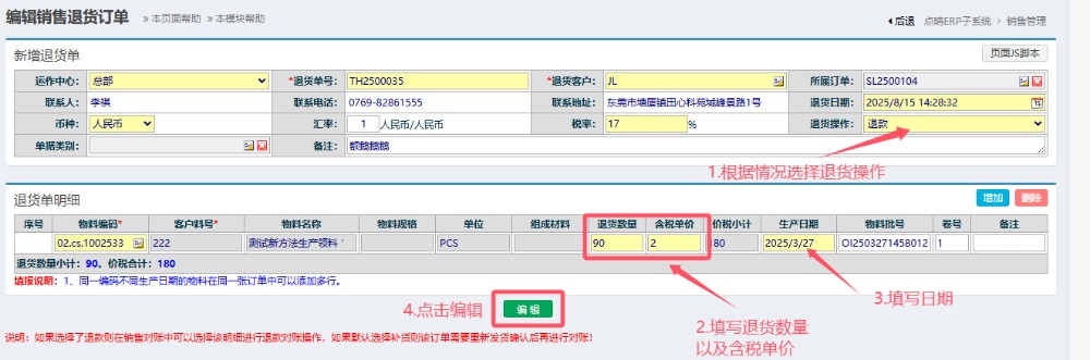 3.点击编辑进入页面后,按图操作:根据情况选择退货操作(退款、补货),填写退货数量、含税单价以及日期。点击编辑。