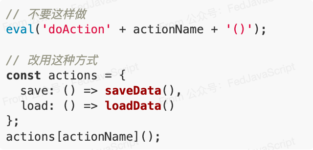 替代方案对于大多数使用eval()的场景,都存在更好的替代方案: 1. 使用JSON.parse替代解析数据2. 使用对象映射替代动态访问3. 使用新的API替代动态计算