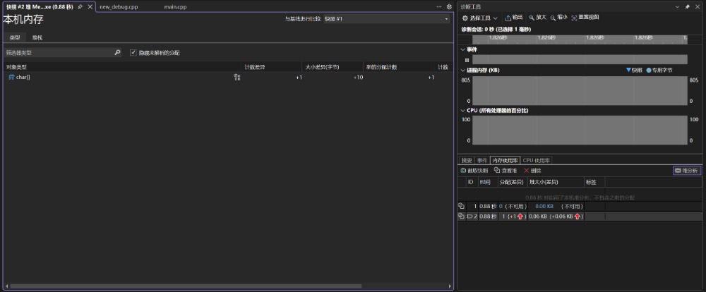 如果我们添加了delete[] p,那就是用完后内存就被归还了。再拍两次快照,对比差异接近 0,泄漏被修复。