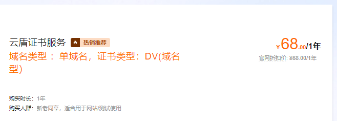 阿里云其实有68元1年的SSL证书,这个性价比还是非常高的,个人觉得还是非常值得购买,不管是个人开发者还是企业用户都可以考虑。