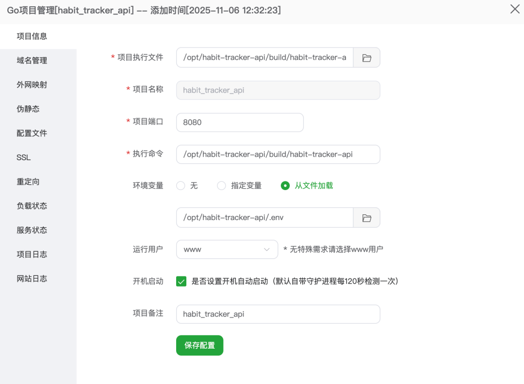 添加一个HTML 项目,这里解释下由于 HTML 项目和反代理用的是同一个Nginx,这里配置好以后,不需要在反代理那边再配置,底层操作的是同一个 Nginx。